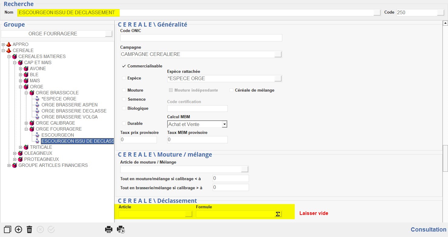 Dans les fiches articles les critères de déclassement seront définis. Lors de l'apport de céréales, selon la valeur des caractéristiques renseignées, la variété sera alors conservée ou bien basculée sur l'article de déclassement.