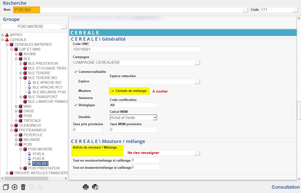 Dans l'article de mélange, on précise que c'est un article de mouture/mélange :