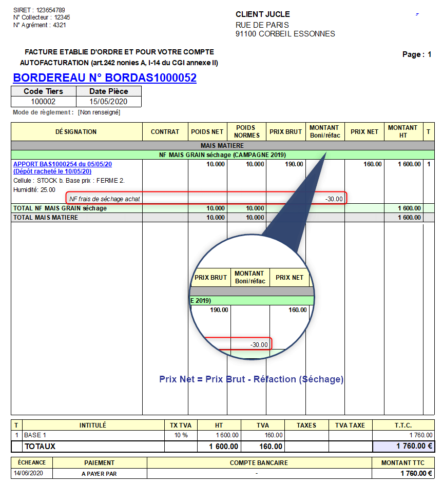 Un exemple de bordereau d'apport avec facturation de frais de séchage est présenté et détaillé ci-dessous.