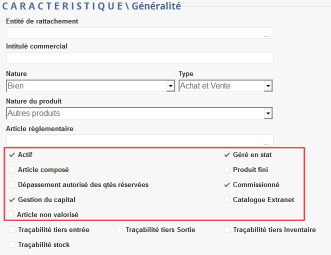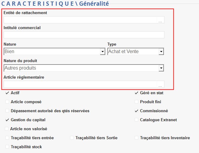 Dans cette partie, on trouvera toutes les informations relatives aux caractéristiques particulières de l'article (conditionnement, stockage, valorisation, facturation commune aux deux activités, …)