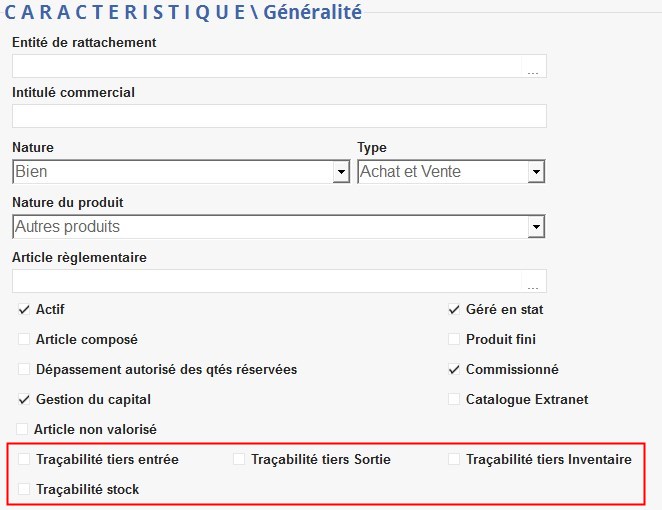 Si les cases de traçabilité sont absentes de la fiche, il faut alors retourner paramétrer la fiche entité administrative en cochant la case lot
