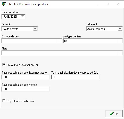 Le mode de calcul et/ou la valeur du “capital théorique” et des “ristournes” se paramètre dans les fiches Groupes Articles. Mais il peut aussi être défini dans le traitement lui-même. Si les deux sont renseignés, les paramètres du groupe article sont prioritaires devant ceux du traitement.