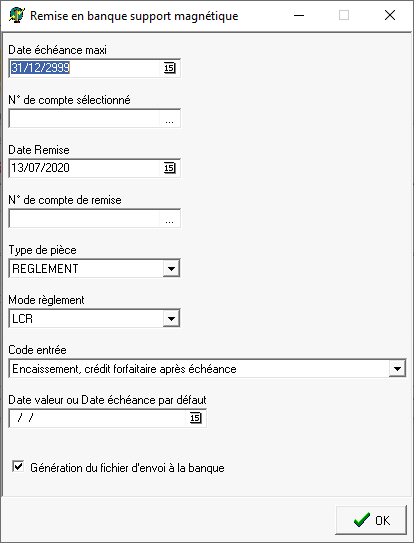 Permet de sélectionner en fonction des dates de remise saisies dans la pièce de règlement.
