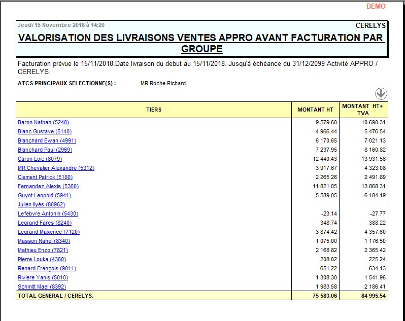 | Tri par | Article, ATC, ATC principal, Chronologie date d'échéance, Chronologie date pièce, Code article, Entité, Groupe, Périodicité, Tiers, Type tiers. |