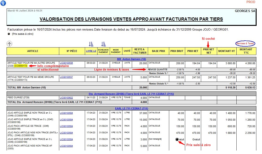 | Information supplémentaire | Visible si “Niveau de détail” = 2 Choix d'affichage d'informations complémentaires, affichées entre parenthèse après le nom de l'article : Origine (commande), Commune de livraison ou rien. |