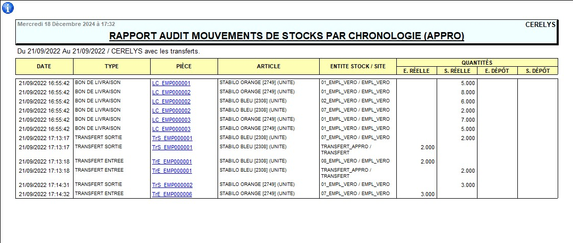 Liste chronologique des mouvements entrés et sortis.