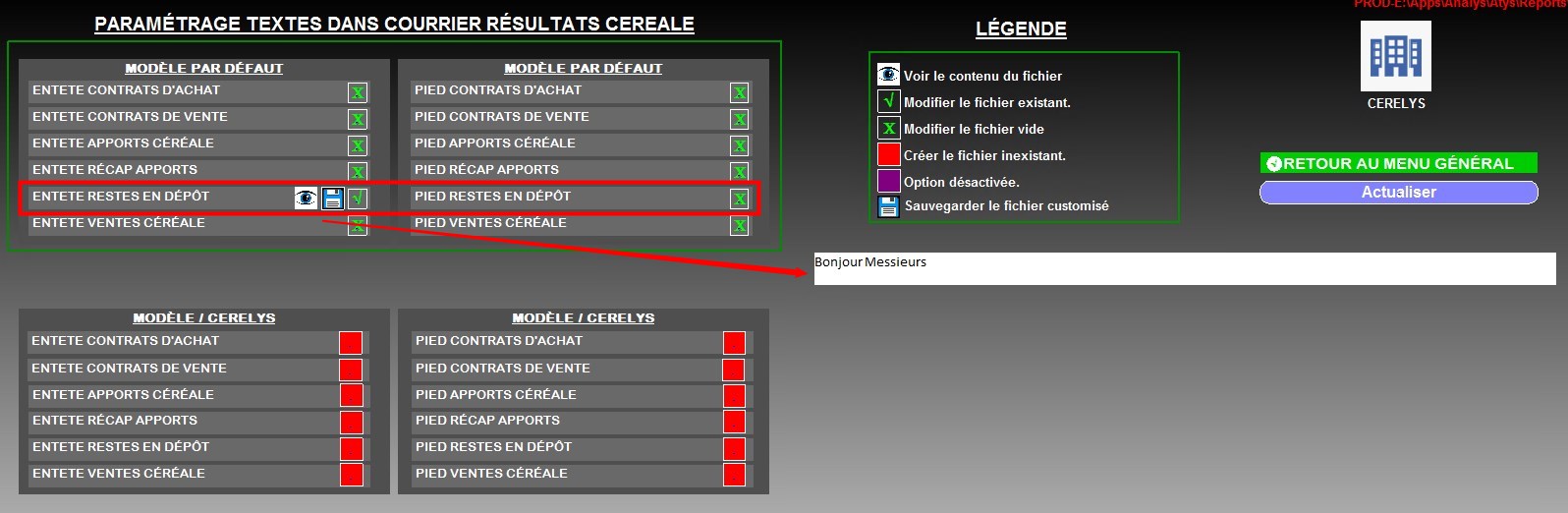 | Céréale | Filtre d'un ou plusieurs articles. Si aucun article n'est sélectionné, alors il y aura la possibilité de sélectionner un groupe article après validation de la fenêtre de paramètres. |