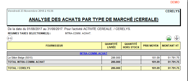 Rapport financier des achats Céréale avec notion de régime de taxe.