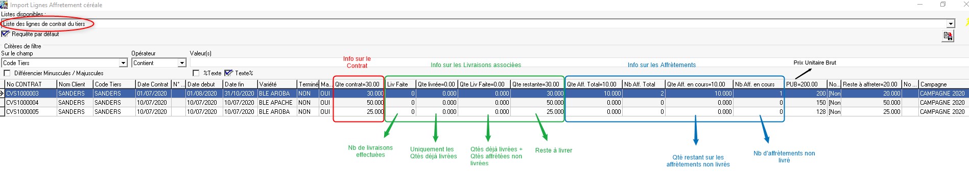 A la validation de la pièce Pont Bascule, le numéro de contrat auquel l'affrètement était associé remonte à la fois dans la pièce Pont Bascule mais aussi dans la pièce de Livraison Vente Céréale automatiquement générée par le pont Bascule.