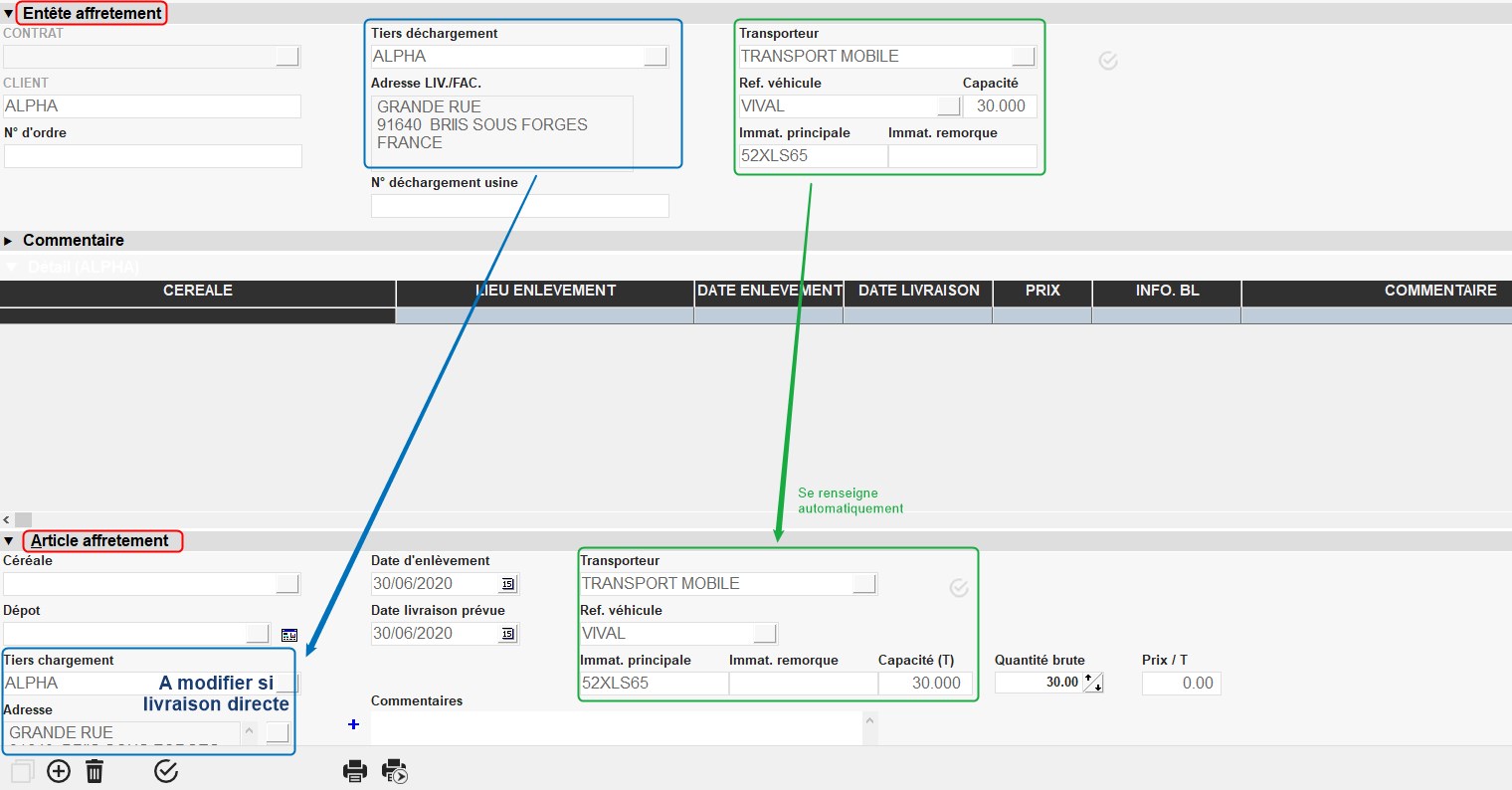 La pièce d'affrètement est, de manière générale, utilisée comme une pièce intermédiaire entre le contrat de vente céréale et la pièce de mouvement céréale (qui peut être directement la pièce de Livraison Vente Céréale ou la pièce de Pont Bascule Céréale).
