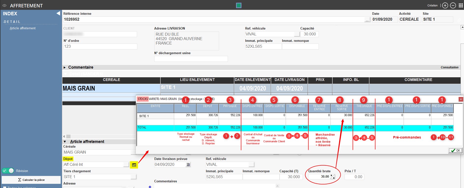 - Paramétrage, dans le circuit administratif du site de production, de la pièce Affrètement (Activité céréale)