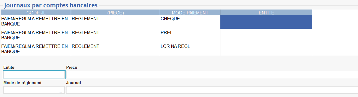 - Journaux par compte bancaires (collection) : Associe un journal comptable à chaque type de pièce (Règlement, Paiement, Remise en Banque), pour chaque mode de règlement.