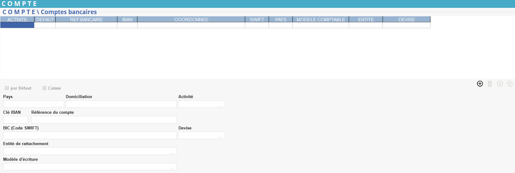 - Comptes bancaires : Permet de paramétrer un ou plusieurs comptes bancaires pour l'agence, dont un doit être coché “Par défaut” (obligatoire).