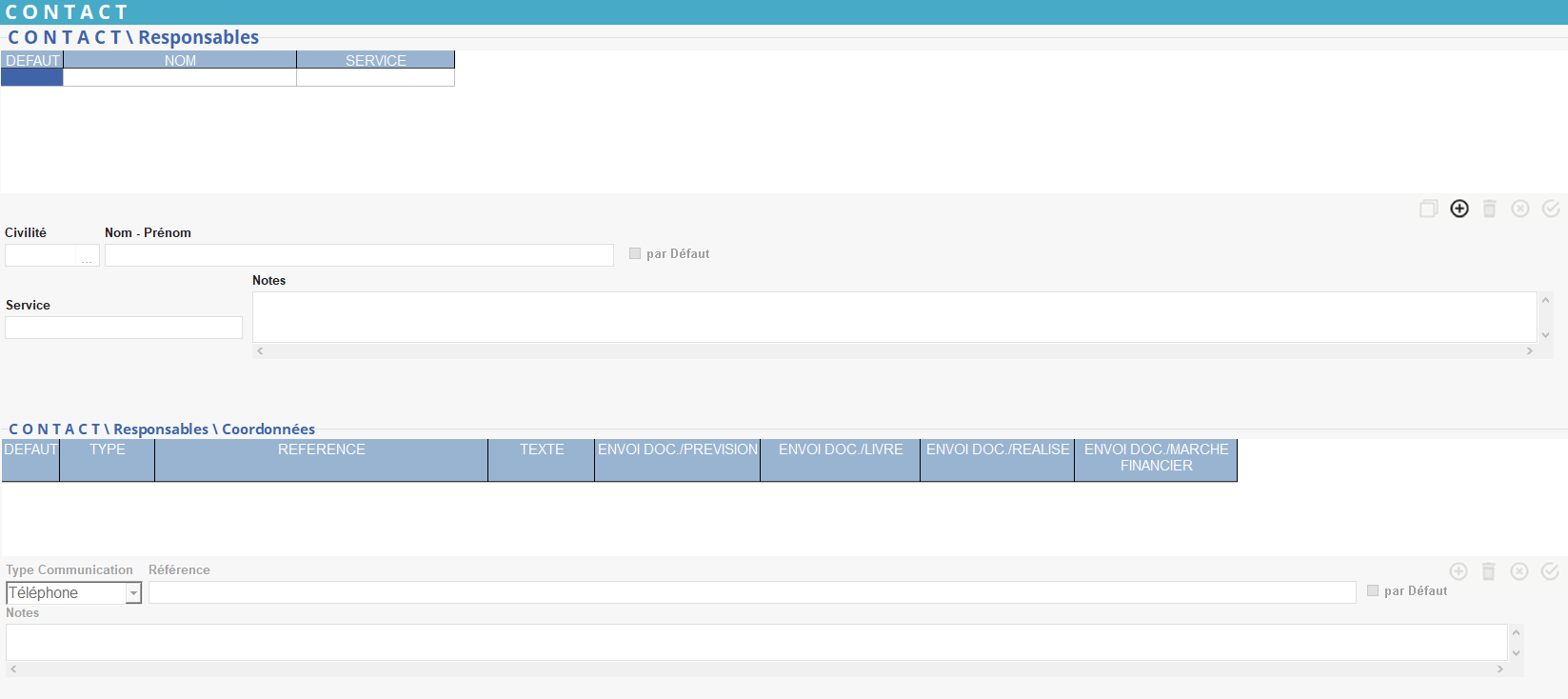 Paramétrer un ou plusieurs responsables afin d’attribuer à chacun, une ou plusieurs coordonnées de communication (téléphone, fax, email, portable). Paramétrer un responsable par défaut.
