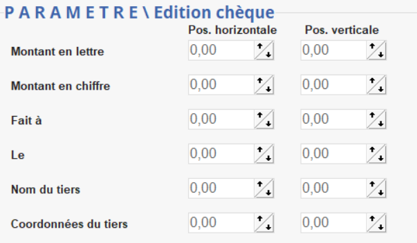 - Renseigner les positions horizontales (depuis la gauche du chèque) et verticales (depuis le haut du chèque) des différents éléments du chèque pour l'édition des lettres-chèques (montant en lettre, en chiffre, etc…).