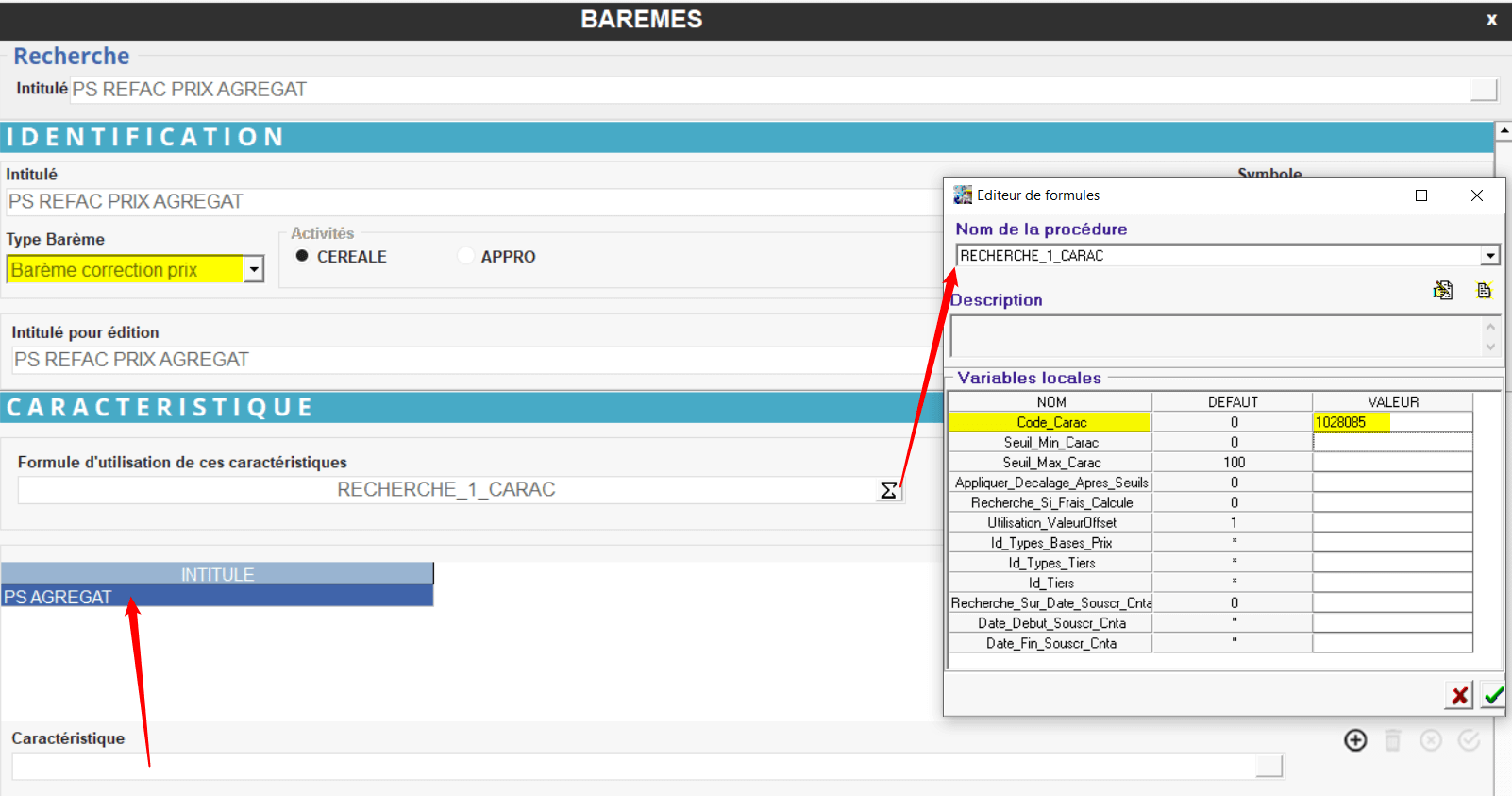 Pour utiliser une caractéristique utilisant une valeur agrégée dans un barème, il suffit de renseigner le code (de recherche) de la caractéristique dans la formule d'utilisation et d'ajouter l'intitulé de la caractéristique.