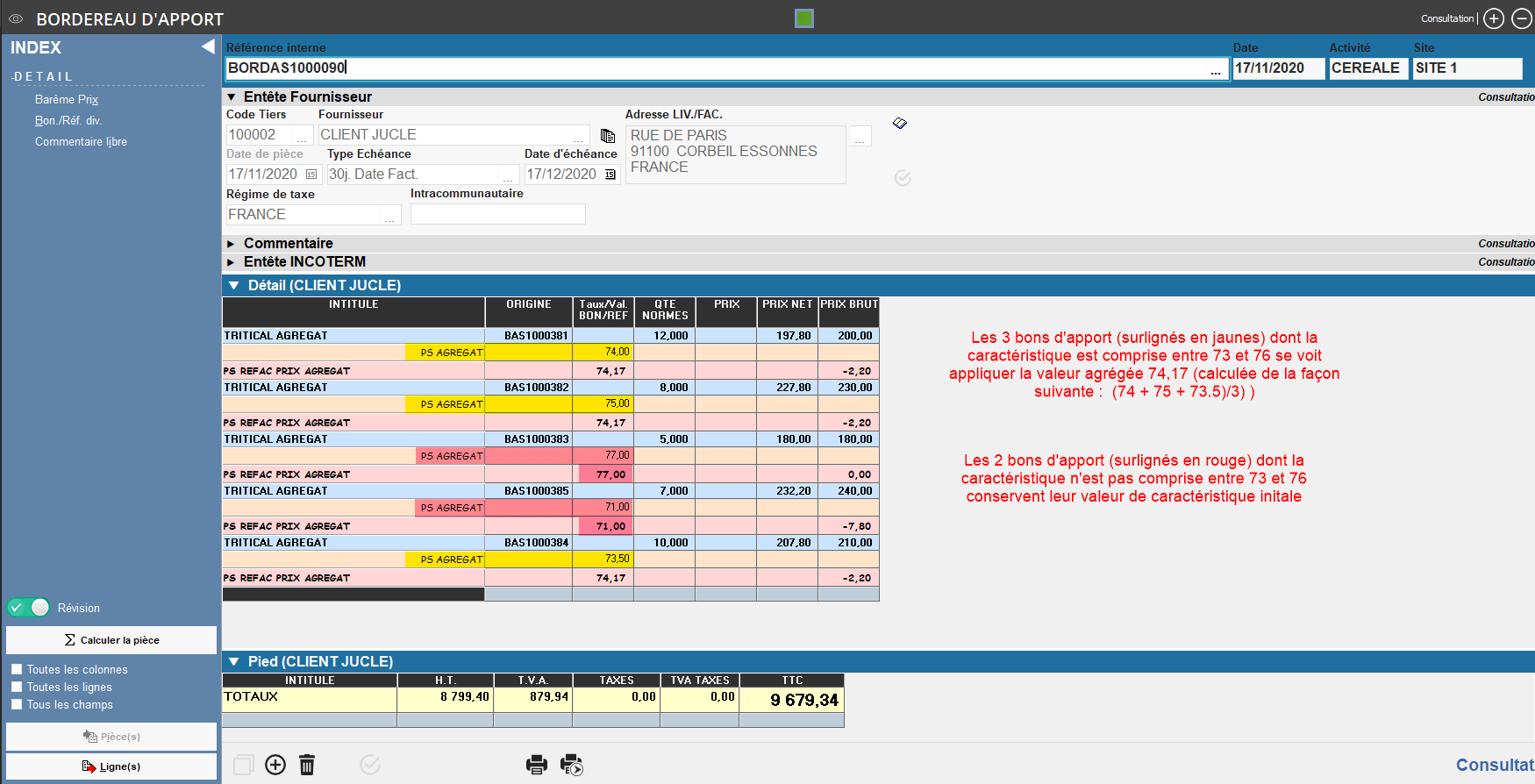 - 1 = vrai, le calcul de la valeur agrégée se fait sur la période campagne ou Mois ou quinzaine ou journée, de la date de la pièce de bon d'apport en origine du bordereau d'apport.
