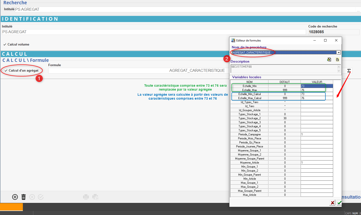 Créer ou modifier une caractéristique afin d'indiquer le mode de calcul de l'échelle à partir d'un agrégat qui y sera paramétré :