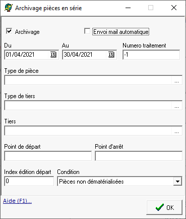 Filtre de sélection des pièces à archiver et/ou envoyer par mail. - Point de départ / Point d’arrêt