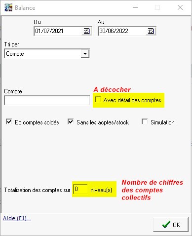 Procédure pour éditer une balance des comptes avec les comptes collectifs uniquement, même dans le cas d'une comptabilité détaillée.