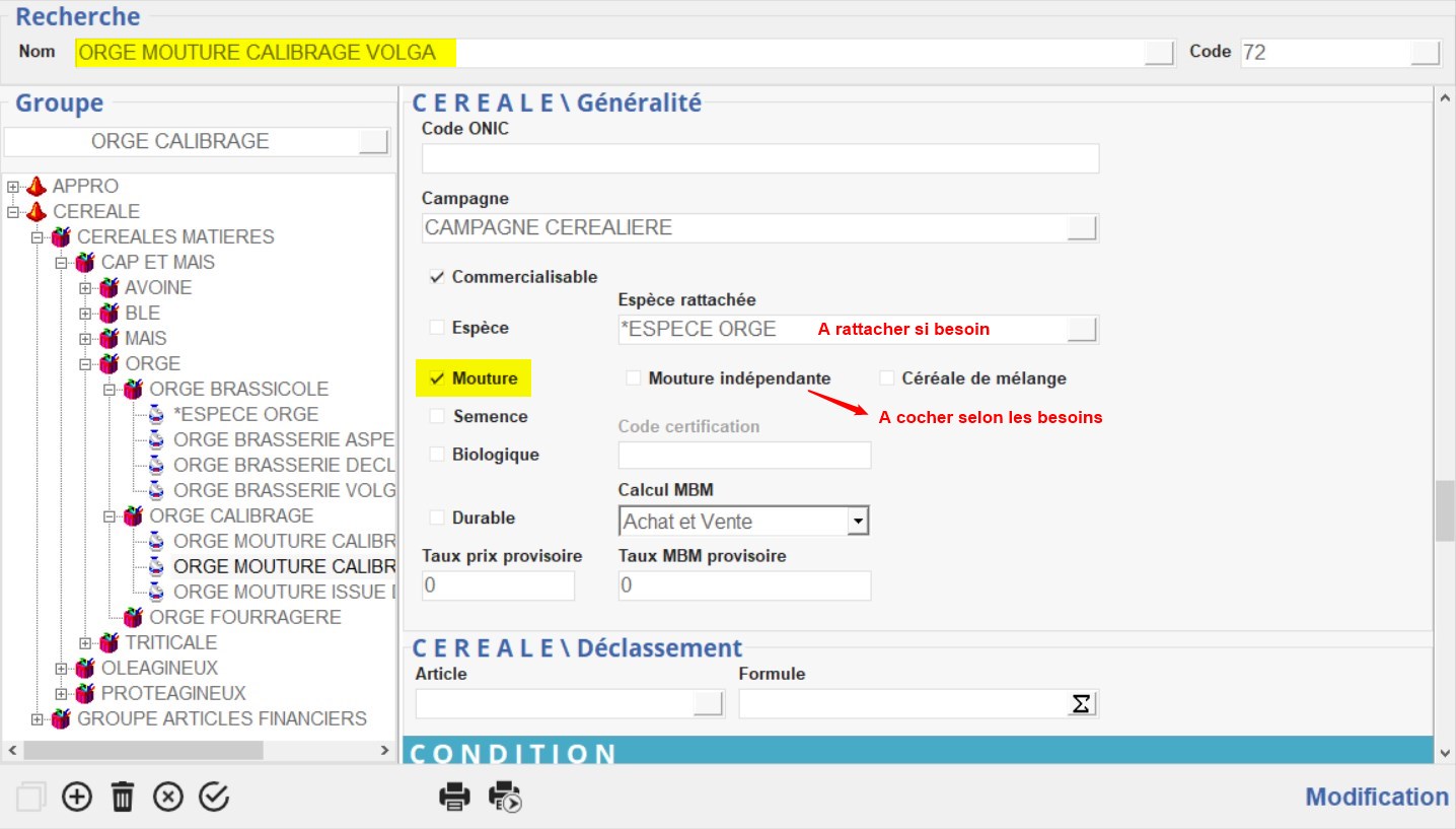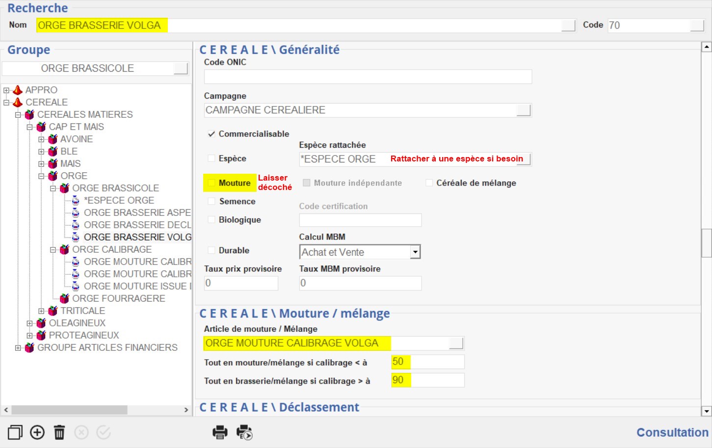 Il est nécessaire de créer deux articles de la même variété concernée : l'un pour la brasserie, l'autre pour la mouture.