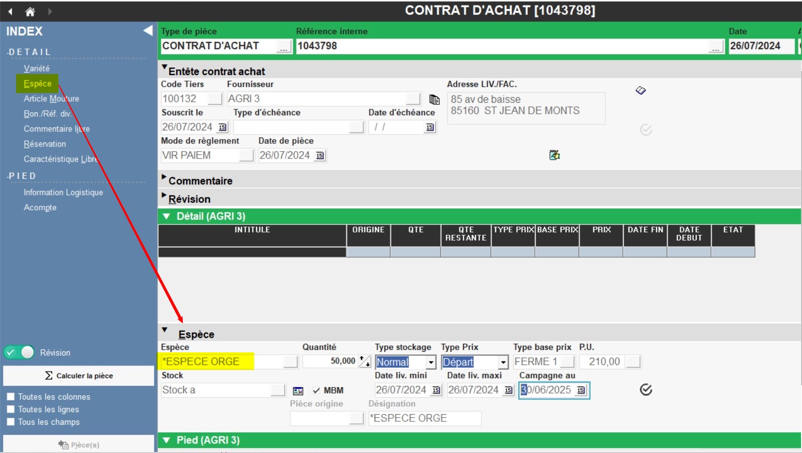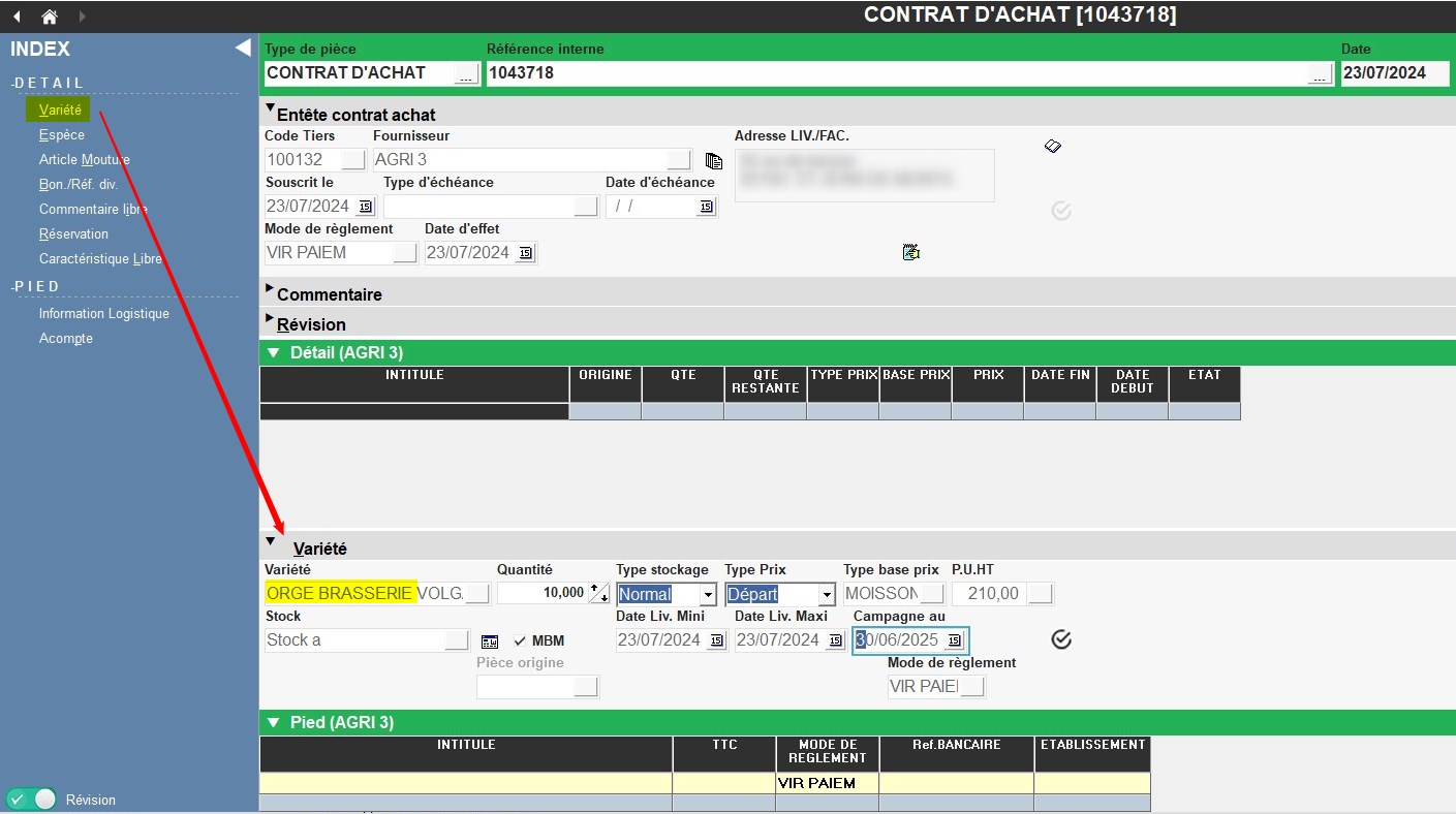 Le CONTRAT D’ACHAT doit être saisi comme suit, et dans l’ordre qui suit, pour sa partie article, si l'on souhaite saisir des contrats à la variété:
