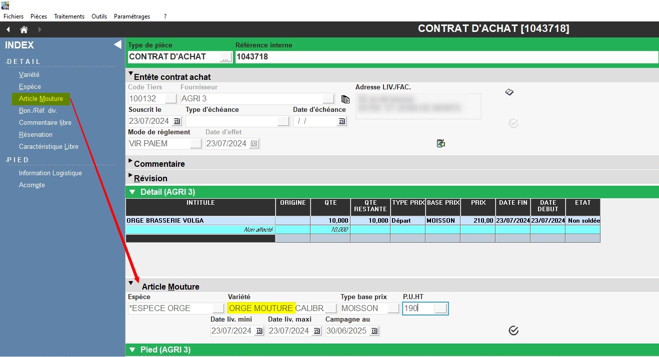 - Si une ligne Article_Mouture est créée dans le contrat d’achat elle ne sert qu’à affecter un prix pour la MOUTURE.