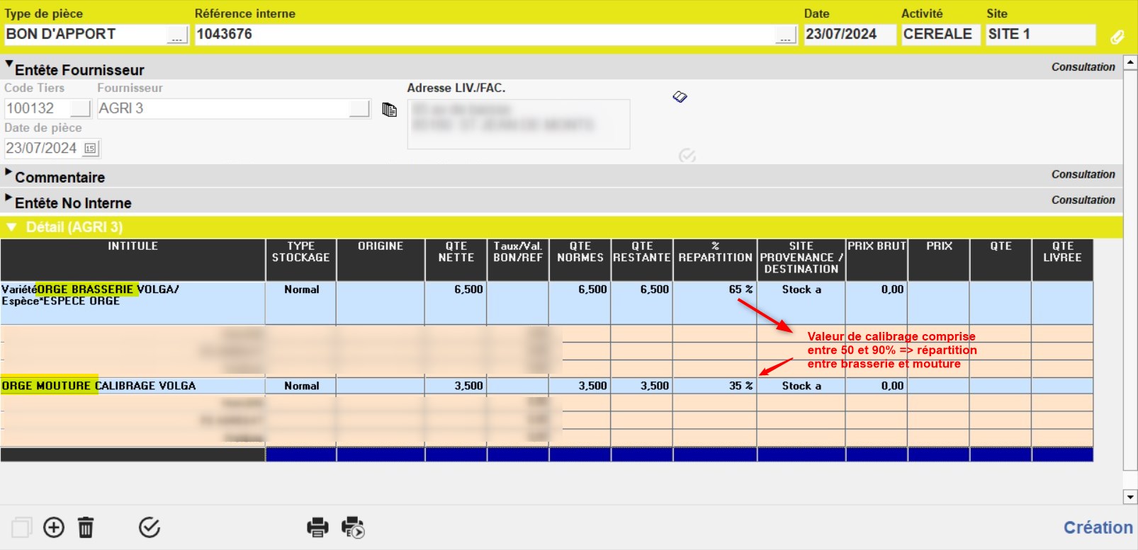 Dans les bons d'apport, selon les pourcentages renseignés dans la fiche article et le pourcentage de brasserie indiqué dans la ligne détail, soit: