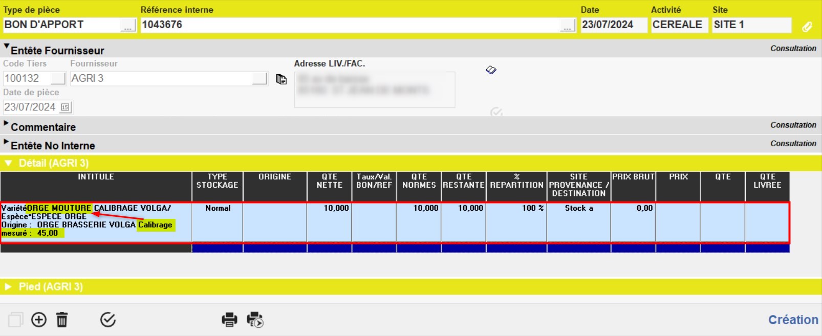 - Sur la ligne Article, à choisir en cliquant dans l’index sur l'intitulé “Variété”, saisir l’article de BRASSERIE avec la quantité prévue pour la Brasserie si celle-ci est connue exactement; sinon saisir la quantité globale attendue.