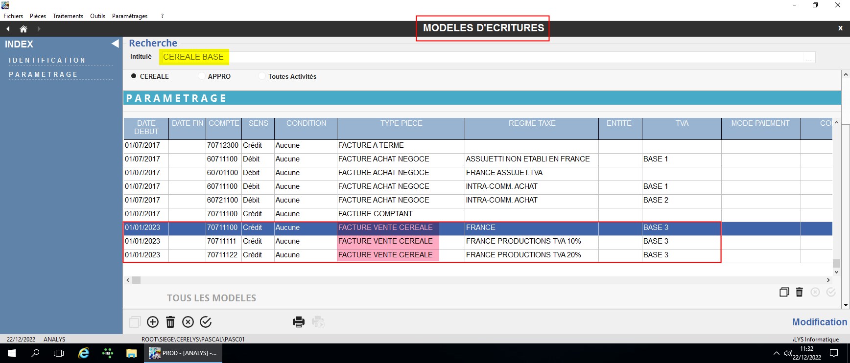- Prévoir les ventilations comptables dans les modèles d’écriture associés et/ou liés aux articles impactés par ce changement de code taux de TVA.