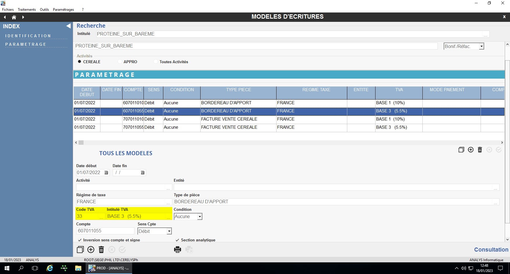 - Il faut aussi contrôler et paramétrer si nécessaire les modèles d’écritures associés et/ou liés aux articles impactés par le changement de code taux TVA, et prévoir les ventilations comptables qui s’imposent.