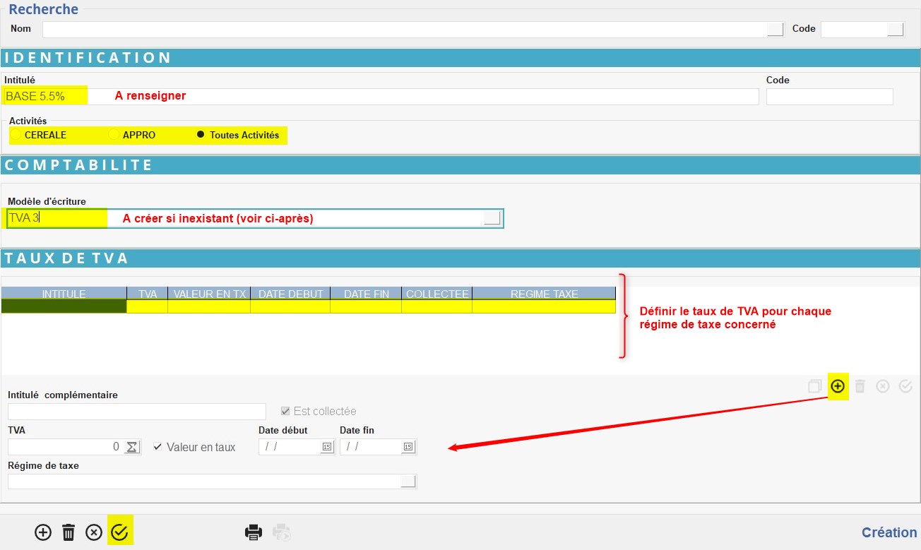 - Modifier le type taux de TVA et mettre le code TVA correspondant au nouveau taux