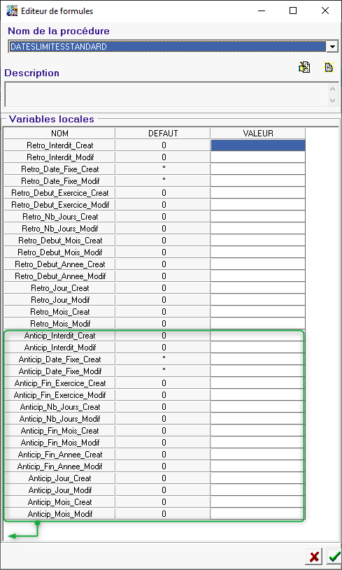 - Anticip fin mois : Renseigner 0 (faux) ou 1 (vrai)