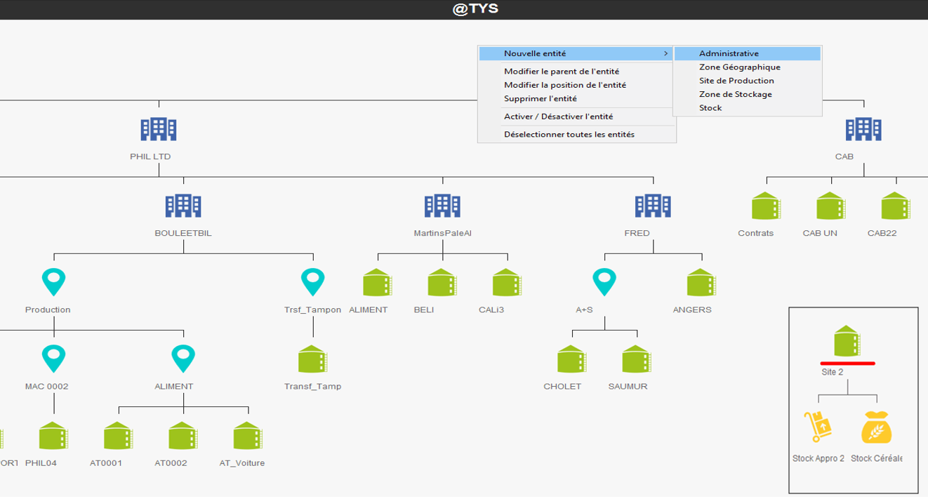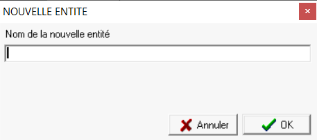 - Nouvelle entité avec proposition des types d’entités disponibles, pour créer la structure de l'arbre des entités. Se positionner sur l'entité parente de celle qu'on veut créer pour un rattachement correct :