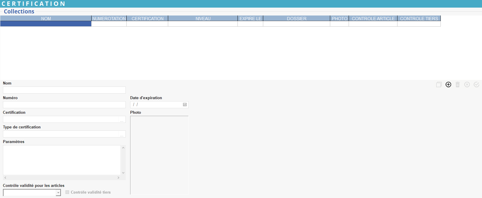 Type de contrôle pour les certifications. Choix dans la liste déroulante. Le contrôle s’effectue en validation de saisie des lignes d’article, il peut être : Bloquant, Avertissant, Pas de contrôle. - Contrôle validité tiers