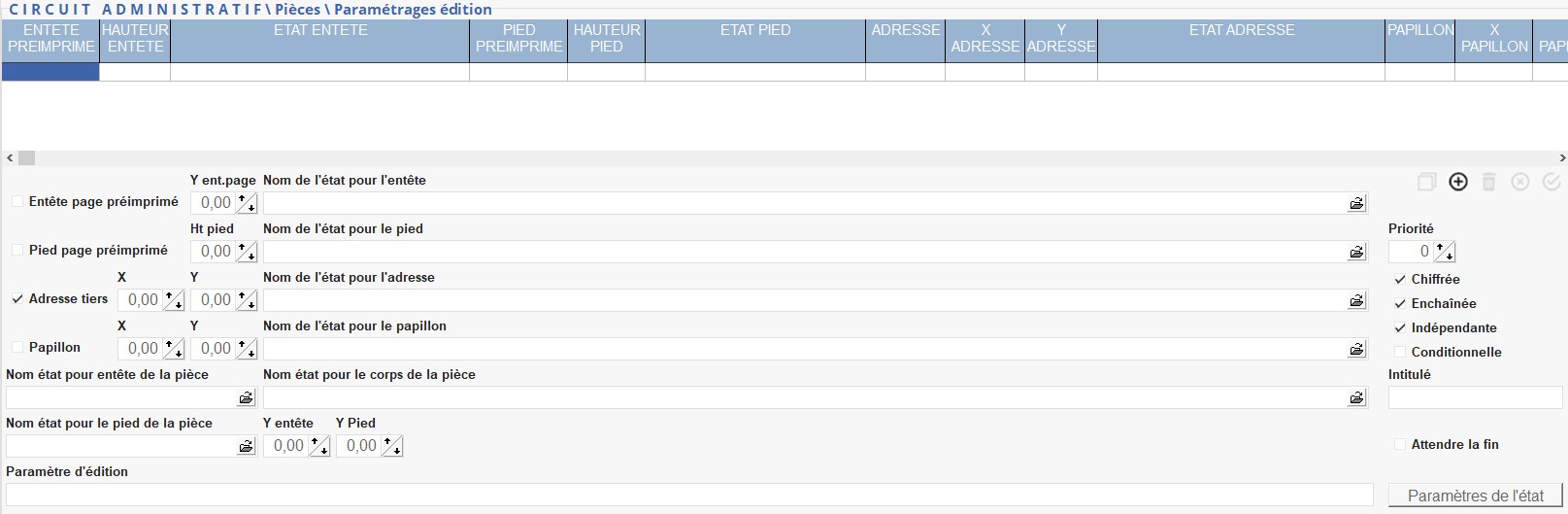 Permet de paramétrer le format des éditions liées aux pièces et leur ordre de priorité lorsqu'elles sont spécifiques au site et qu'elles ne suivent pas la paramétrage par défaut du type de pièce concerné.
