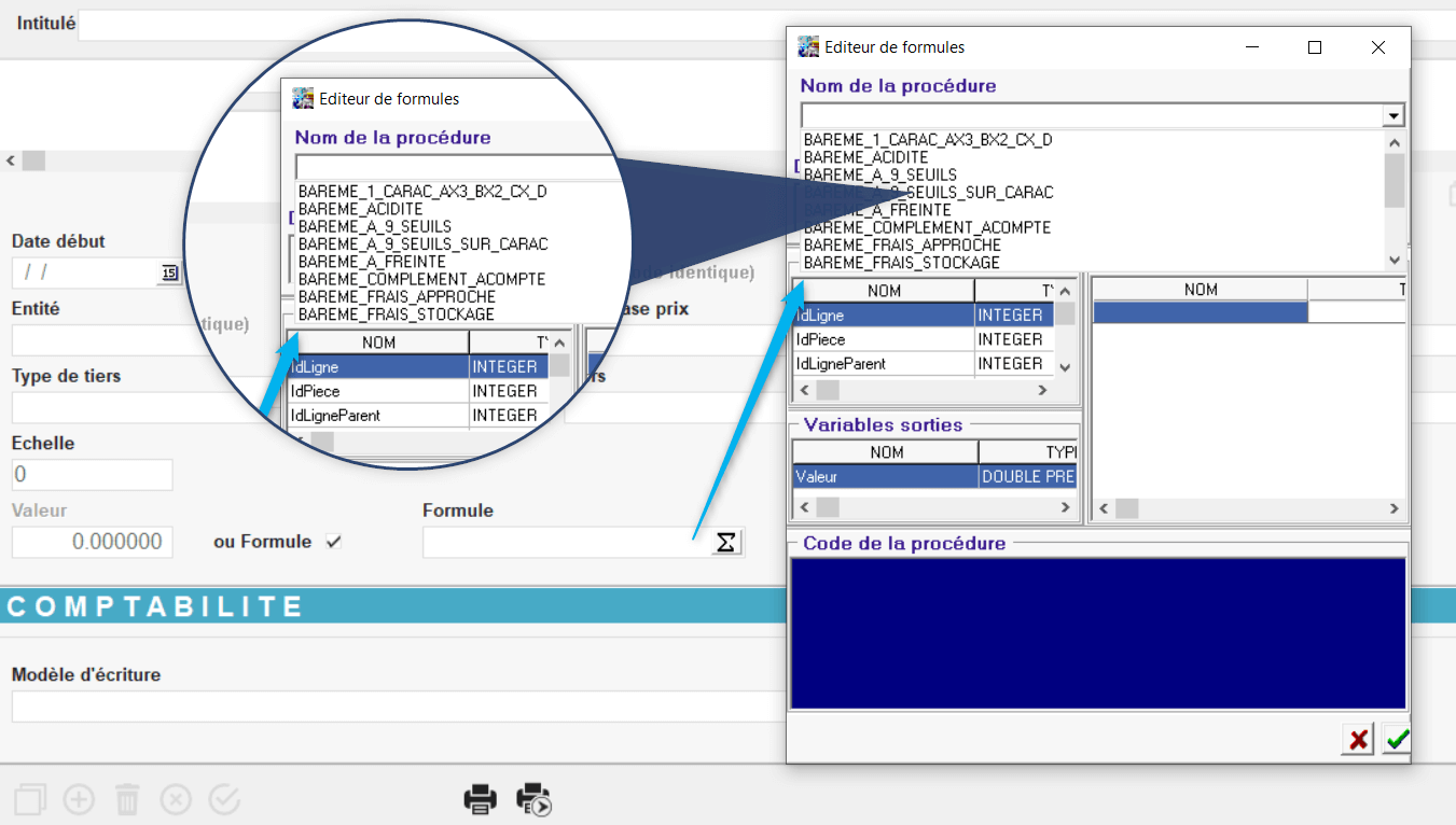 du champ Formule d’utilisation de ces caractéristiques pour atteindre la fenêtre Editeur de formule, - Dans le champ Nom de la Procédure, cliquer sur la flèche noire pour afficher les formules proposées (voir ci-dessous),
