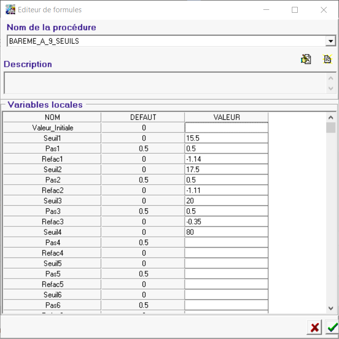 Les formules de procédures permettent de définir le cadre du barème et ses conditions générales d'utilisation (Une seconde formule pourra être utilisée plus loin pour définir le mode de calcul exact des valeurs par pallier).