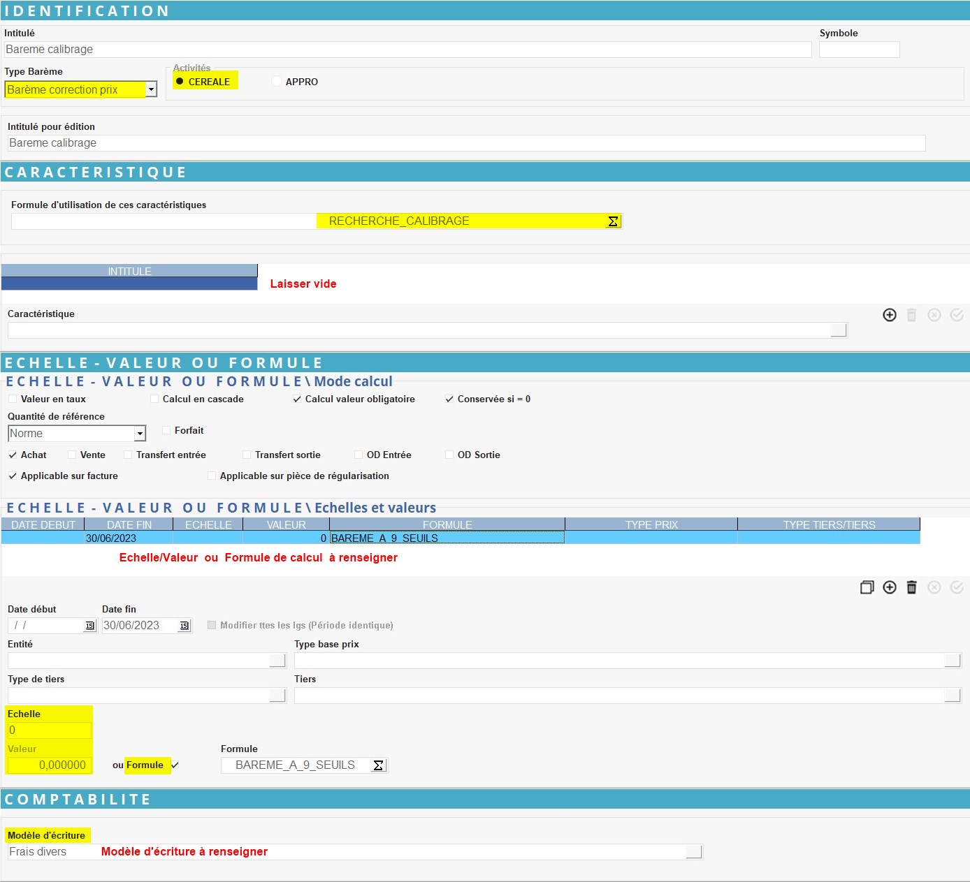 Créer un barème, pour paramétrer les frais à appliquer en fonction des valeurs de calibrage :