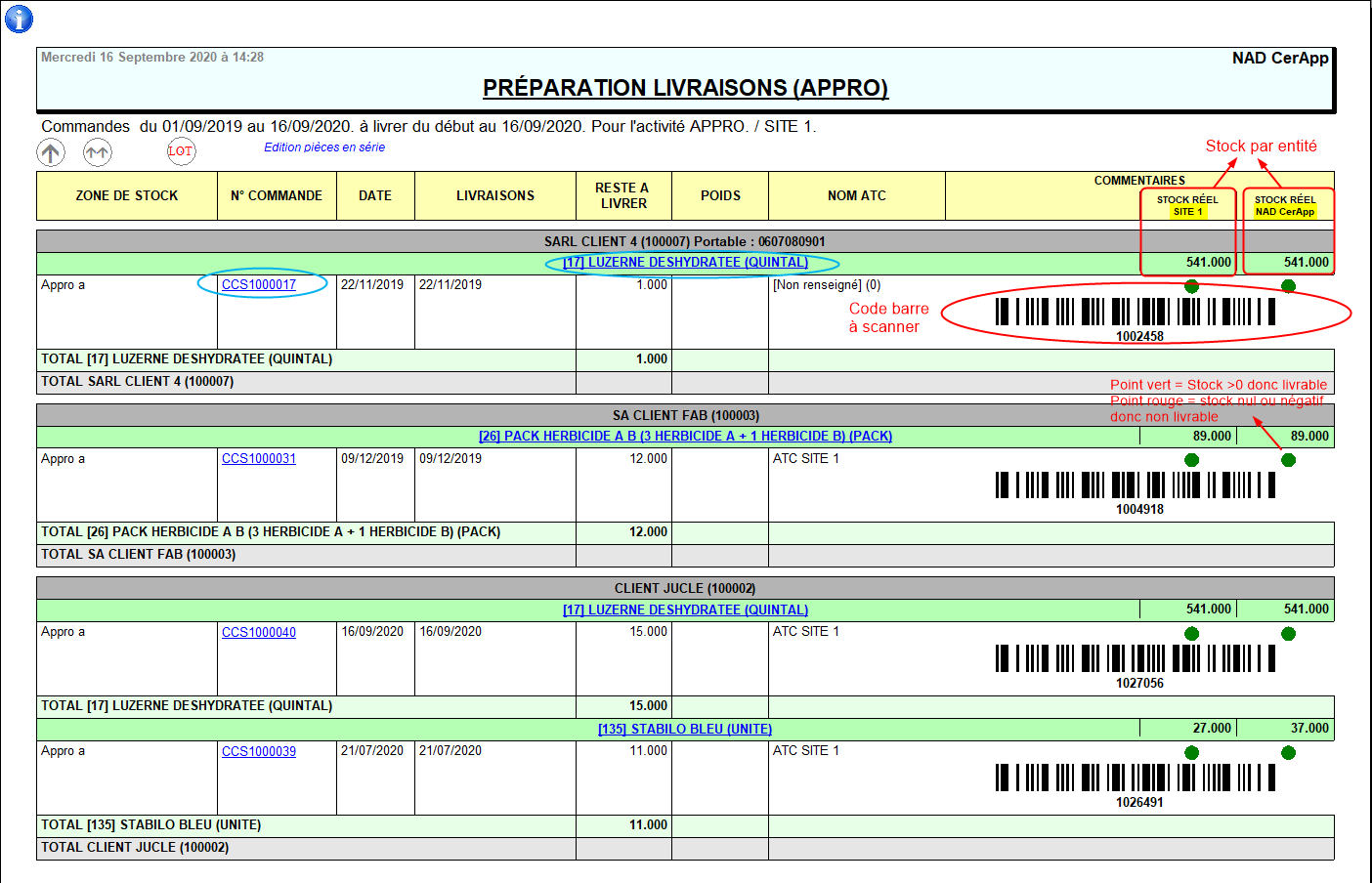 Le stock indiqué correspond au stock au moment de l'édition, il n'est pas réactualisé au fur et à mesure des préparations.