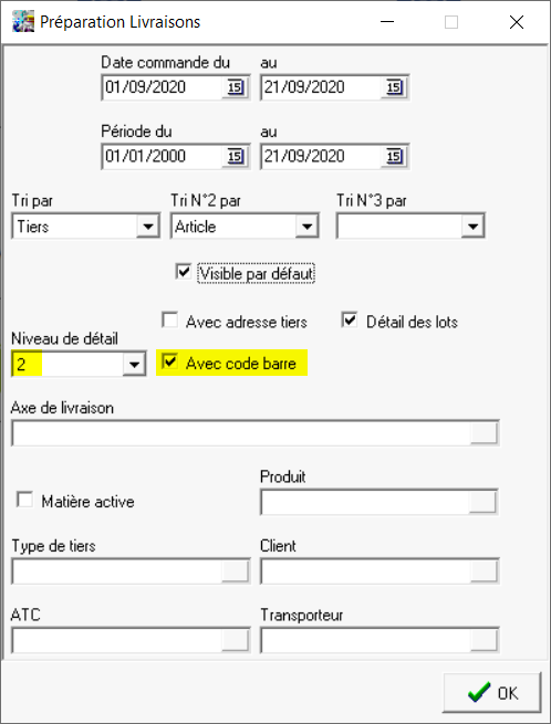 Se positionner en niveau 2 de façon à pouvoir ensuite cocher Avec code barre (non disponible en niveau 1) - Axe de livraison / Matière active / Produit / Type de Tiers / Client / ATC / Transporteur