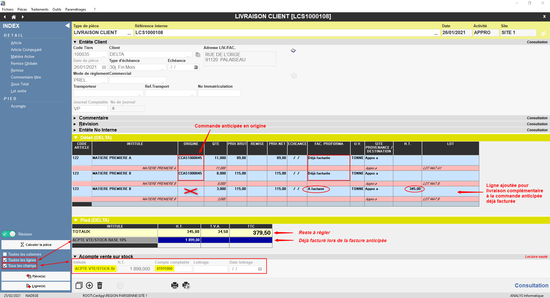 Les factures anticipées peuvent être gérées comptablement via un compte 419, qui permet d'identifier les marchandises facturées et non livrées d'un point de vue comptable. Une fois les marchandises livrées, ce compte 419 sera soldé au profit d'un compte 707. (paramétrage à voir avec Analys)