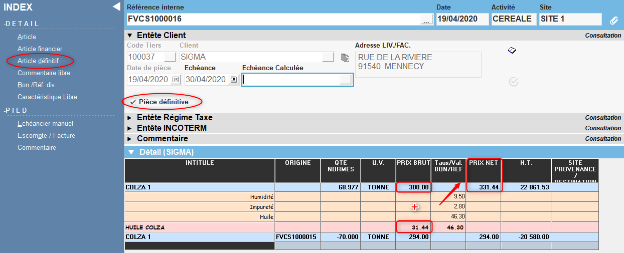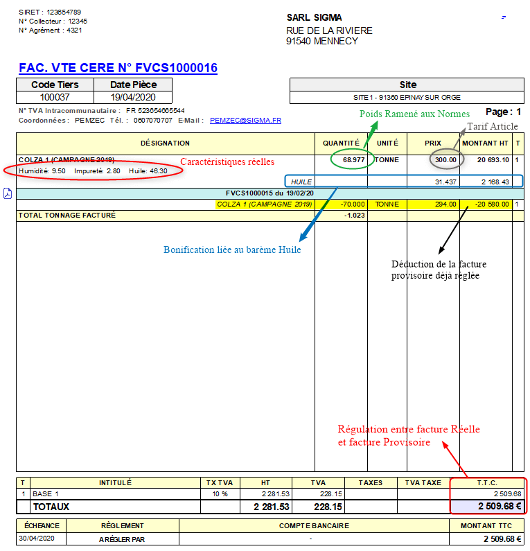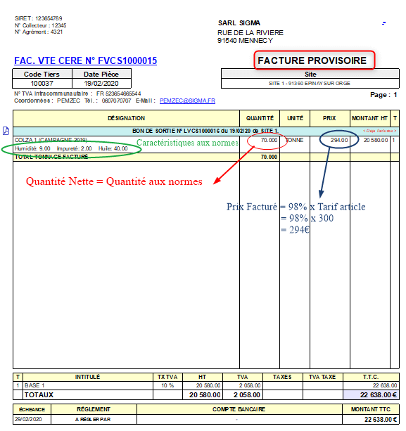 Dans le cas de la vente d'oléagineux, certaines caractéristiques, Point d'huile et Acidité, ne sont pas connus lors de la livraison de la marchandise, mais plus tard. Il est donc habituel, de facturer provisoirement cette marchandise, à 98% de la facture “aux normes”. Au retour des analyses, une facture définitive, de régulation de tarif, qui reprendra les valeurs réelles de ces caractéristiques, sera éditée.