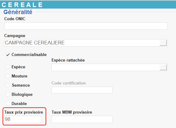 - Le prix brut renseigné se calcule automatiquement à partir du taux provisoire et du tarif indiqué dans le bon de livraison client.La ligne Article de la pièce Livraison Vente Céréale doit obligatoirement comporter un tarif, sinon le taux provisoire ne pourra pas être appliqué.
