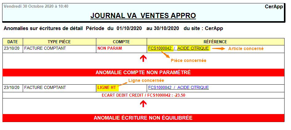 - Editer le Contrôle journaux Matières du mois et pour le journal concerné afin d'identifier précisément la ligne article posant problème (page 1 du rapport).