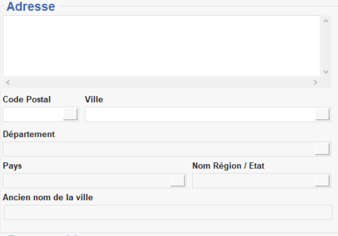 - Code postal , Ville : choix dans la table des Code Postaux . Si inexistant F4 pour lien vers la table et création de la ville et son code postal rattachée au pays correspondant. Les département, Pays et région se renseignent automatiquement en fonction du code postal choisi.