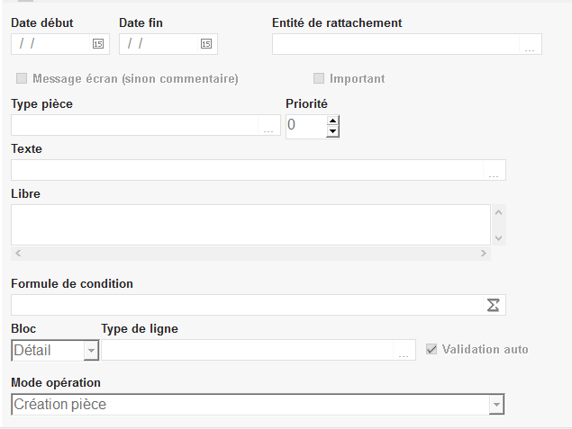 Possibilité de paramétrer ici un ou plusieurs commentaires ou messages écran par type de pièces, comme dans l'activité Appro.
