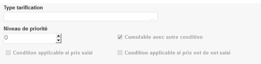 Si décoché alors la condition appliquée sera celle qui aura la priorité maximale (voir champ “niveau de priorité”) et aucune autre condition tarifaire ne s'appliquera en plus. - Condition applicable si prix saisi