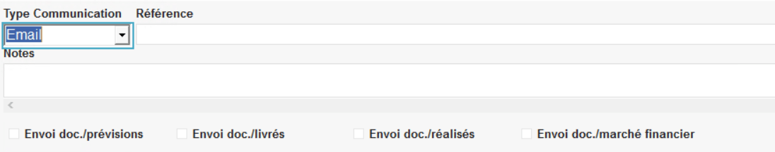 - Lors du choix du type communication Email, 4 champs à cocher sont présentés. Cocher ces champs permet l’utilisation de la dématérialisation de document selon le type » (même si ce mail n’est pas « par défaut ») :