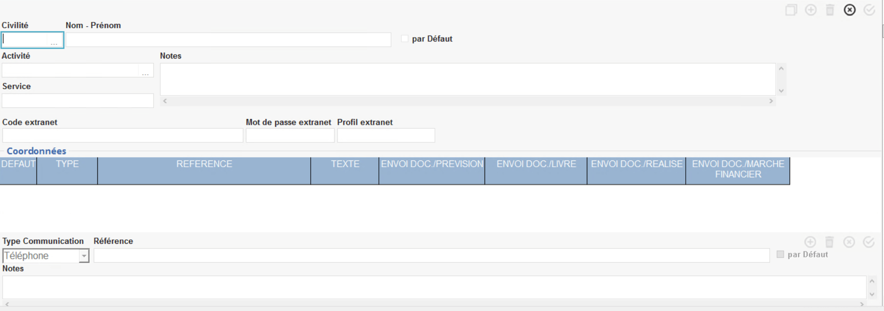 Sélectionner un responsable puis utiliser le bouton ajout :- Choisir le type de communication dans la liste, saisir le numéro ou l’adresse mail dans la case référence. Dès lors qu'un type de communication est référencé au moins une fois, paramétrer obligatoirement une coordonnée par défaut et par type de communication.
